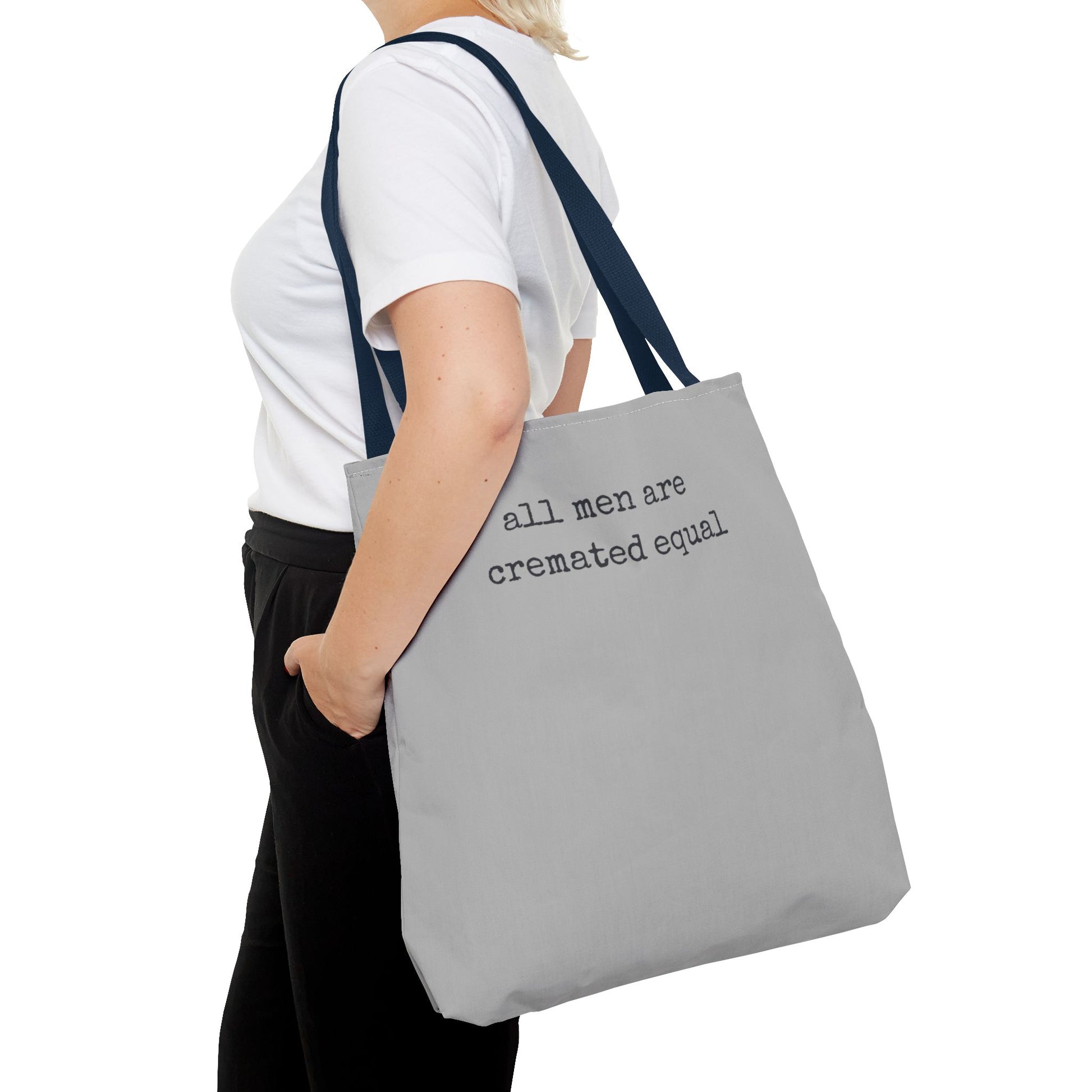 This durable polyester tote carries a quiet, dark sense of humor in a minimalist package. The light-gray body shows a small, typewriter-style line of text near the top that reads “all men are cremated equal,” delivering a wry, provocative statement without shouting. Reinforced handles and boxed corners give the bag structure and extra room, while the clean, simple aesthetic pairs with everyday city life — hauling books, groceries, or a laptop to a café. It feels like something a deadpan poet or a mordant storyteller would sling over their shoulder on errands, reading groups, or late-night bar crawls. The understated print invites a double-take and a knowing smile; this tote moves effortlessly from routine to conversation starter.